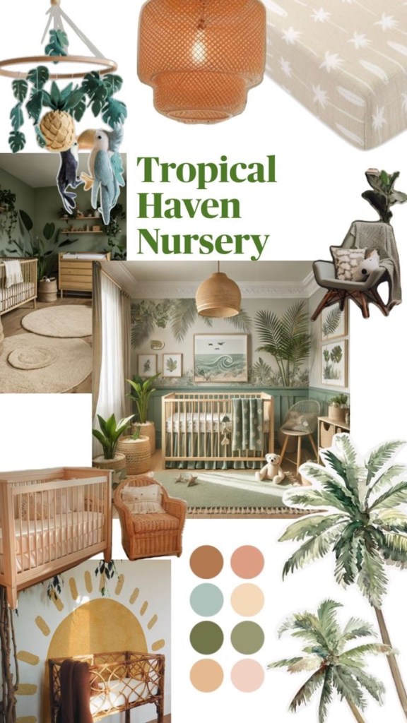 Tropical Haven: Soothing sage green nursery with beach and jungle vibes a mix of both land and see. I was thinking the walls can either have palm leaf and ocean wave accents. For the furniture, I thought of keeping it natural with neutral wood, rattan baskets, and soft textiles and white-to-beige curtain set a cozy tone. Here’s my Pinterest board for the look.