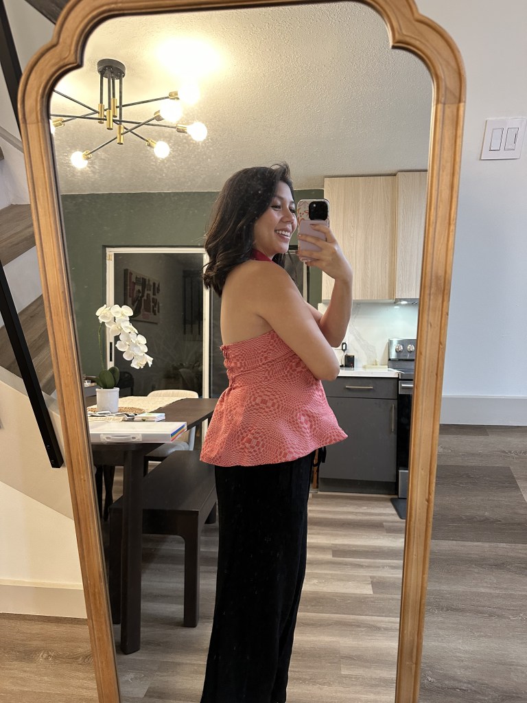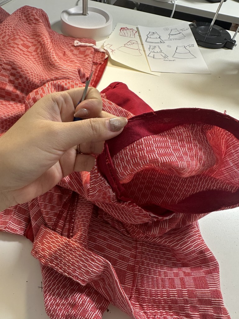 Throughout this process, Deborah brought her expertise and creativity to the table, ensuring the redesign honored the craftsmanship of the original piece from ANTHILL while making it uniquely mine. We worked together to cut the fabric from the back and the sleeves. Then used the original skirt to create the peplum part of the top. We added a gartered back panel so that it can continue to have a good fit on the back and waist while still allowing more width to grow.